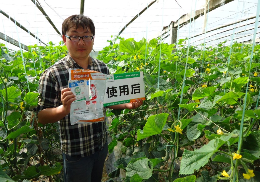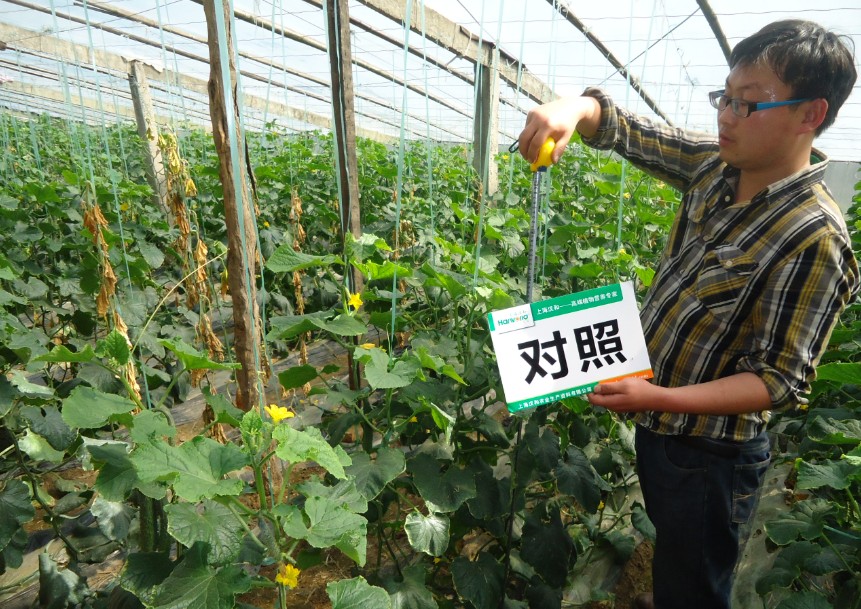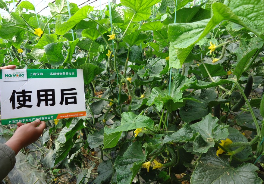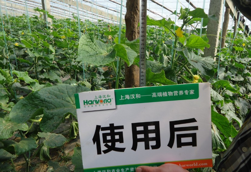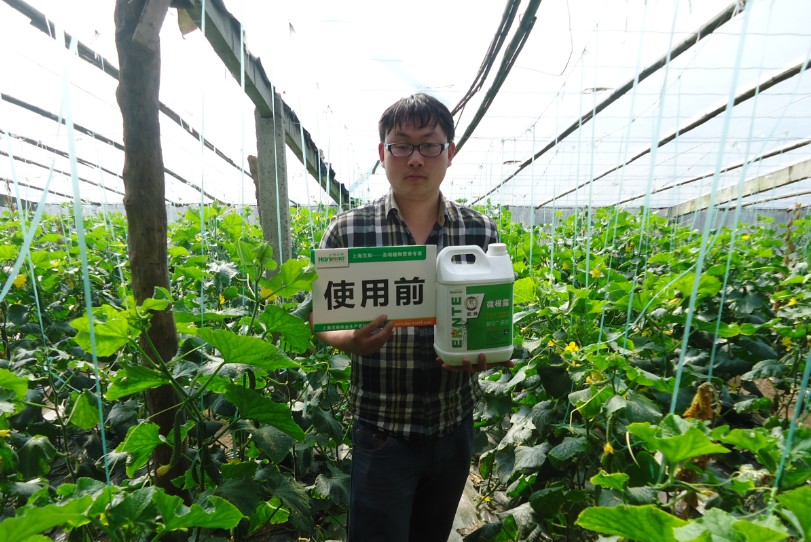 開花和坐果:使用區和對照區分別數10棵黃瓜的坐果數,使用的10棵坐果61個,對照區10棵坐果46個,使用的區域坐果量用肉眼明顯的能觀察到比較多