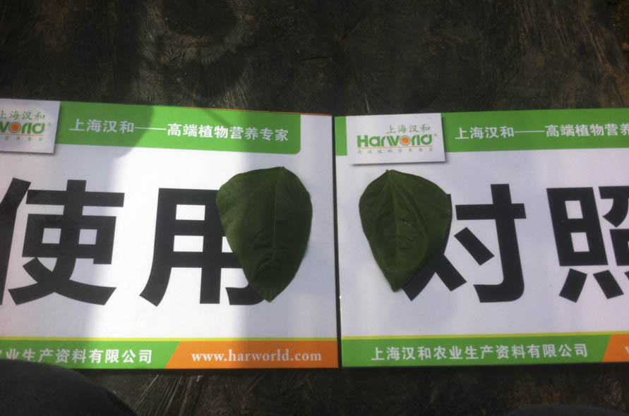 使用與對(duì)照的葉片差別:使用組葉片發(fā)黑而且大,對(duì)照組葉片小且有些黃。